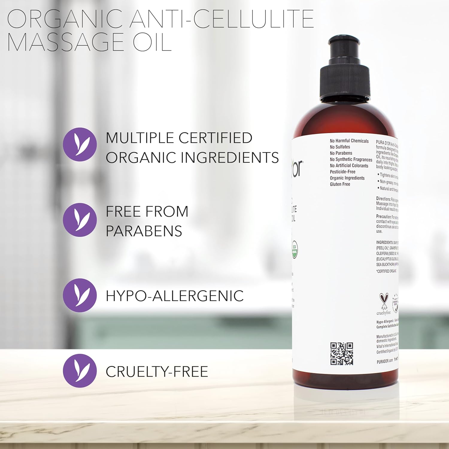 PURA D’OR 16 Oz Organic Anti-Cellulite Massage Oil for Toned Legs and Butt - Lemon Peel, Moringa, Grape Seed, Grapefruit & Eucalyptus Oils - Skin Firming & Tightening