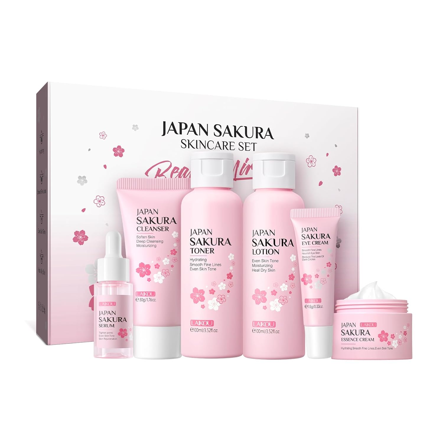 - 【Cleanses & Nourishes Skin】: LAIKOU's toiletries travel kit is infused with cherry blossom extract. Firstly, use the cherry blossom cleanser to clean your face. Secondly, apply the cherry blossom essence, face cream, toner, and lotion to moisturize dry skin. Finally, use the eye cream to reduce dark circles and fade fine lines. This is a ideal gift to help you maintain clean and youthful skin.